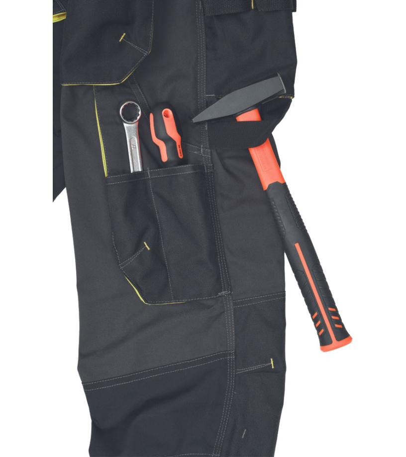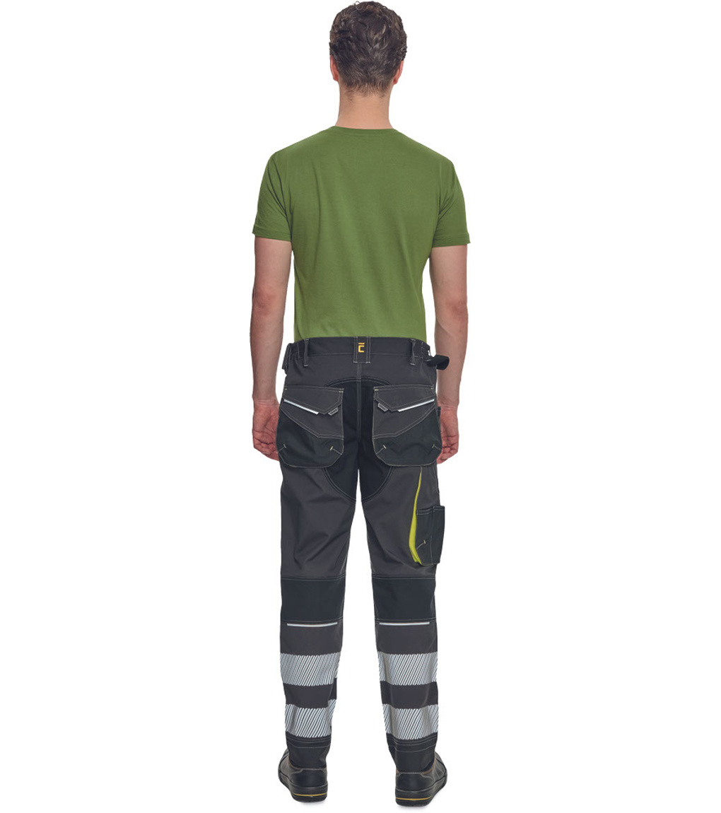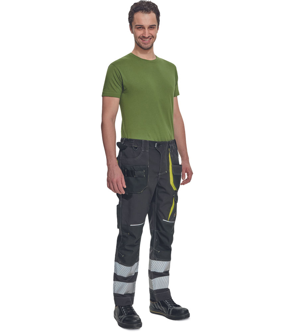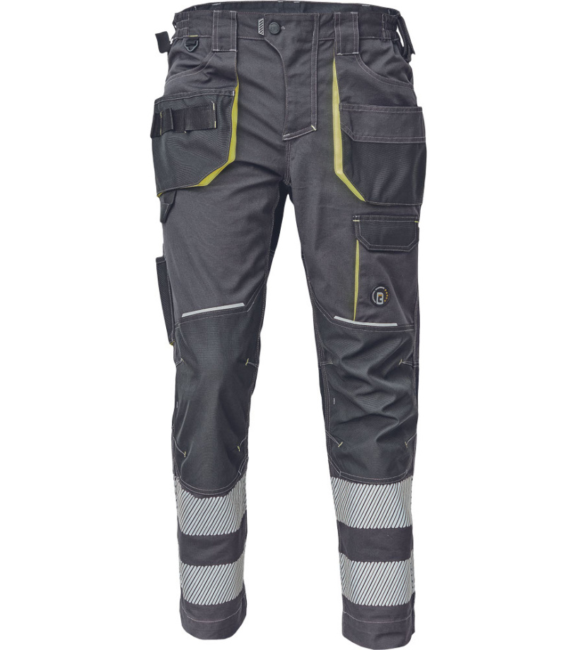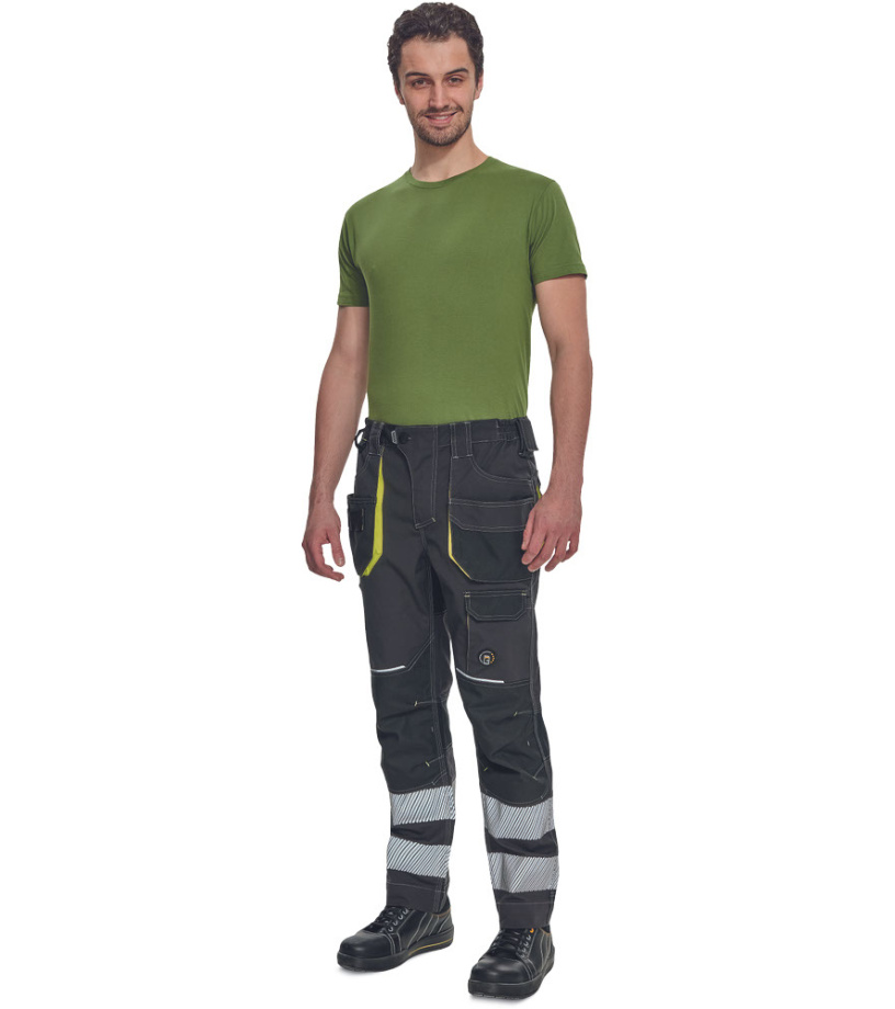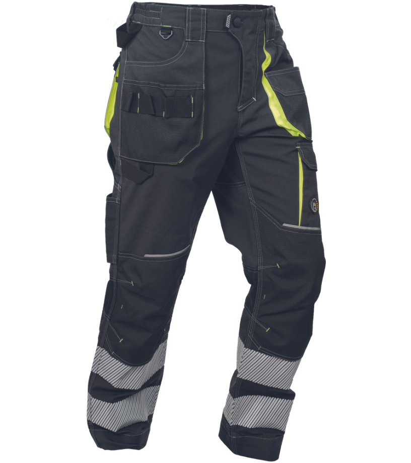 Spodnie robocze męskie z elastycznym pasem i wielofunkcyjnymi kieszeniami • Kieszenie na kolanach wzmocnione materiałem Oxford 600D, umożliwiające włożenie ochronnych nakolanników • Trwałe potrójne szwy na nogawkach i siedzisku • 2 odblaskowe, segmentowane paski o szerokości 7 cm w dolnej części nogawek • Regulowana długość nogawek