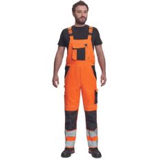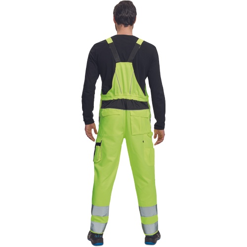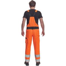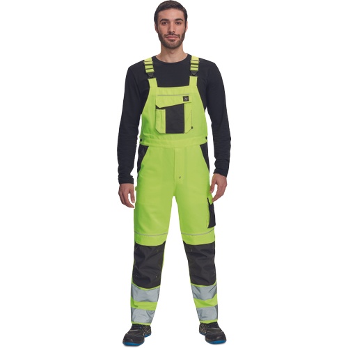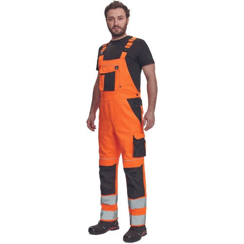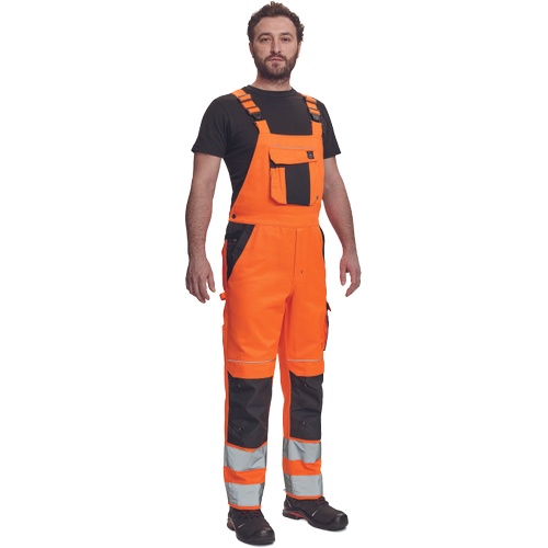 Opis: men's HI-VIS working bib pants with elastic waist; wide braces with plastic buckles; 2 side pockets, 1 double left thigh pocket; 1 big chest pocket, 2 back pockets, 2 small back pockets on right thigh; two 7.5 cm printed reflective stripes on bottom leg parts, reflective piping; Oxford 600D knee parts reinforcement with flap pockets for knee pads insertion; extendable length of legs.