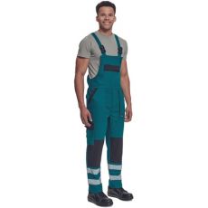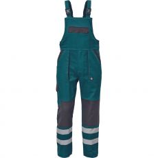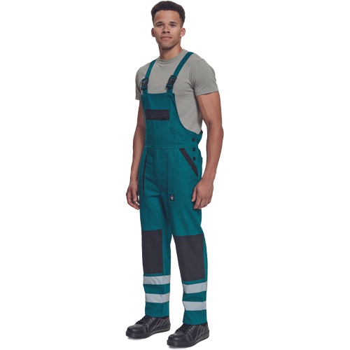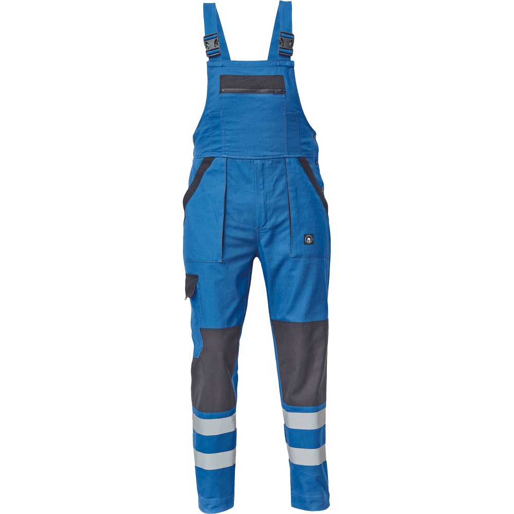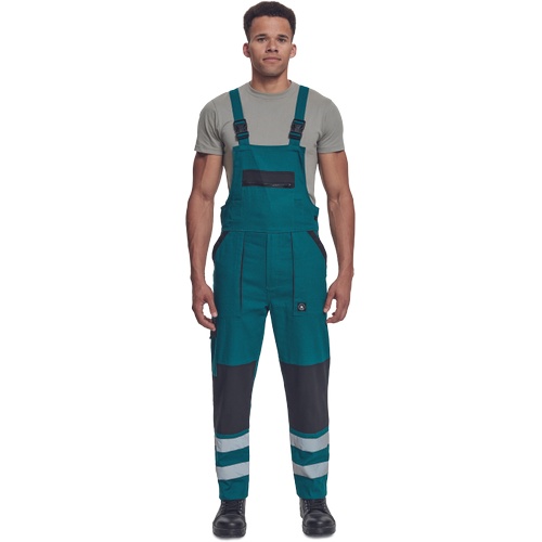 Opis: men´s working bib pants with elastic waist; wide braces with plastic buckles; 2 side pockets, 1 thigh pocket; 1 big chest pocket, 2 back pockets; reflective stripes on bottom leg parts; knee parts reinforcement.