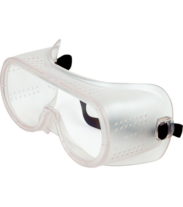 Gogle z płaską szybką poliwęglanową i miękką plastikową częścią twarzową, z wentylacją bezpośrednią, szybka klasy 1F.
