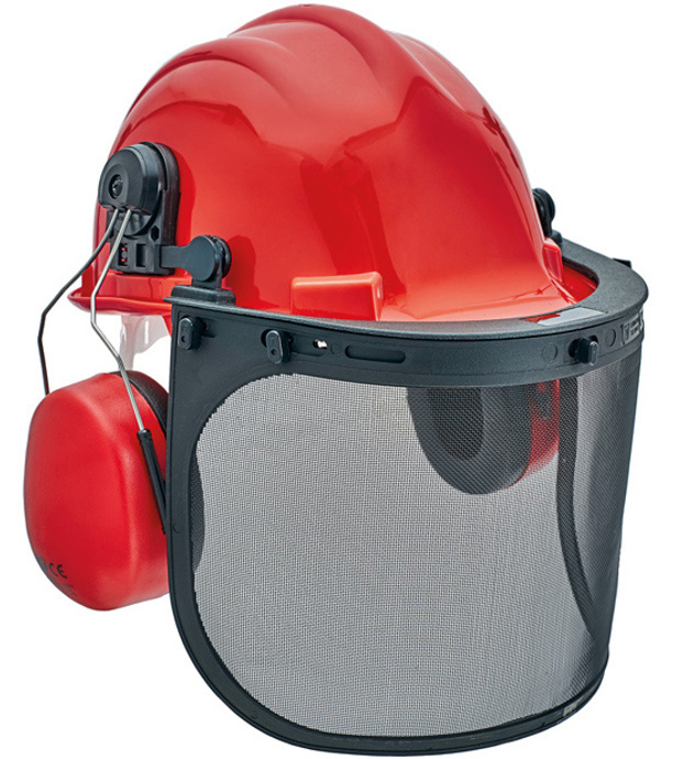 Opis: Zestaw dla leśnika składający się z: kasku wykonananego z tworzywa ABS w kolorze pomarańczowym z możliwością regulacji rozmiaru od 55 do 62 cm, z 4 punktami mocowania, więźba z PE, z osłony twarzy wykonanej z siatki oraz z nahełmowych ochronnikow słuchu w kolorze czerwonym – 26 SNR, EN 352-3: 2002. Kask – EN 397: 2012+A1: 2012, ANSI Z89.1