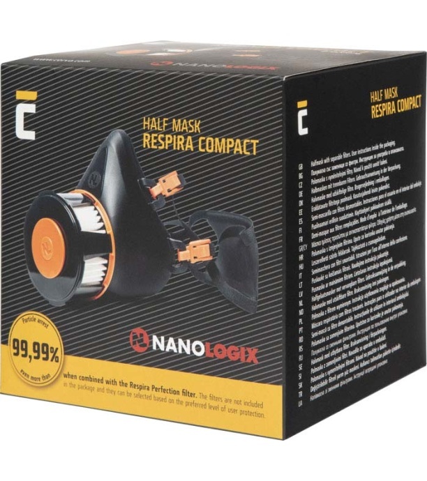 Półmaska ​​Zatrzymuje cząsteczki nawet ponad 99,99 % w połączeniu z filtrem Respira Perfection. Ten produkt nie zawiera żadnych naturalnych składników lateksu kauczuku. Maska Nanologix Respira Compact z filtrem P3 została przetestowana w obiektach w Těchoninie (Czeskie Centrum Obrony Biologicznej) pod kątem szczególnie niebezpiecznych chorób sklasyfikowanych jako 3 poziom bezpieczeństwa biologicznego (BSL 3), takich jak koreańska gorączka krwotoczna, tyfus, HIV, gruźlica i wąglik oraz Choroby BSL 4, takie jak SARS, gorączka Lassa, ospa i Ebola. Opakowanie zawiera tylko półmaskę.