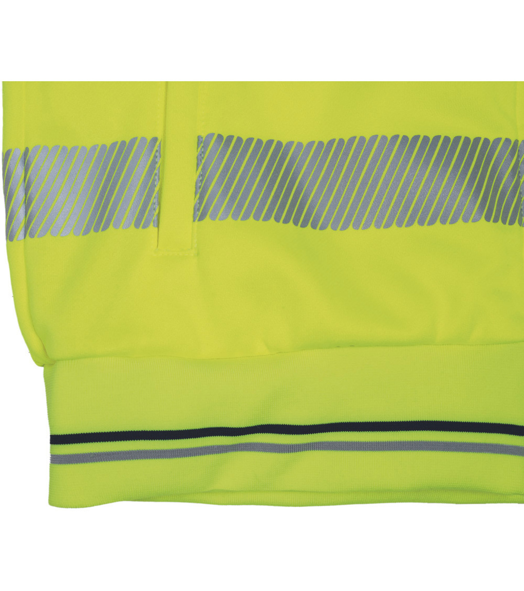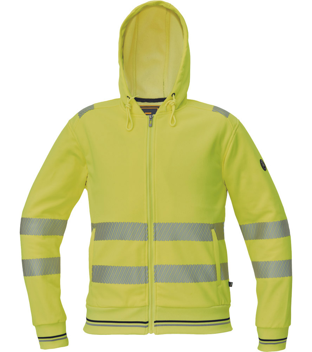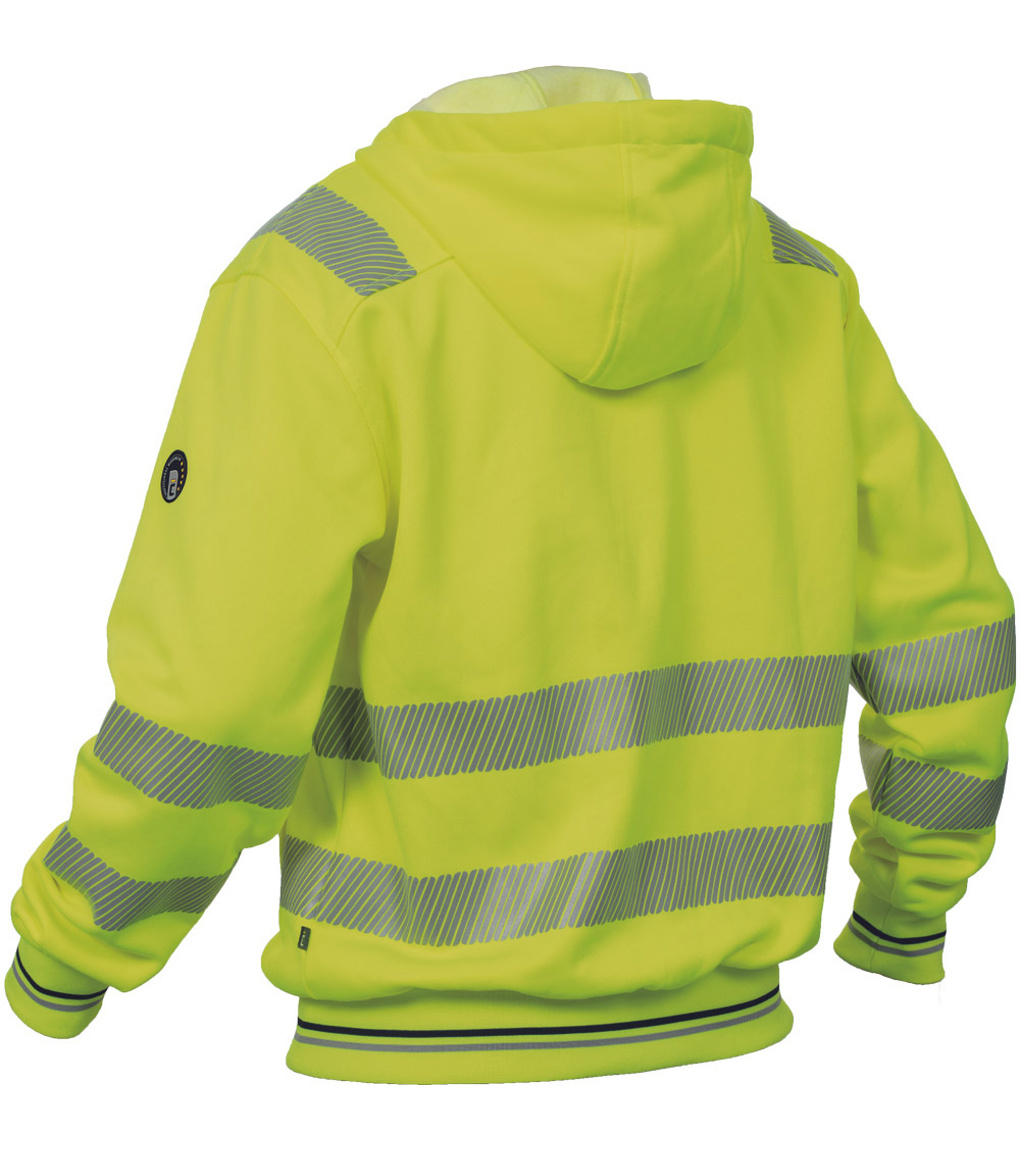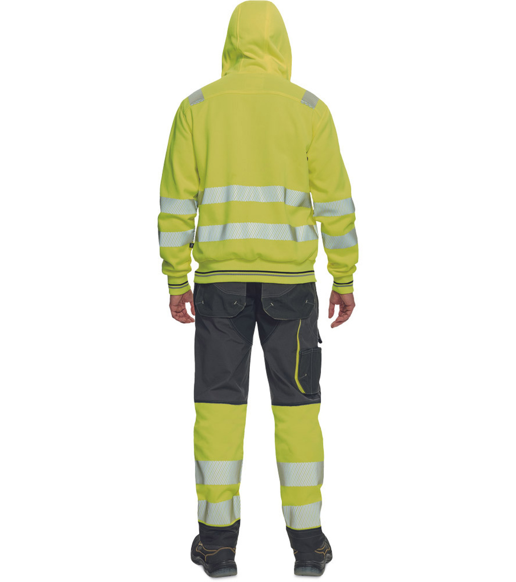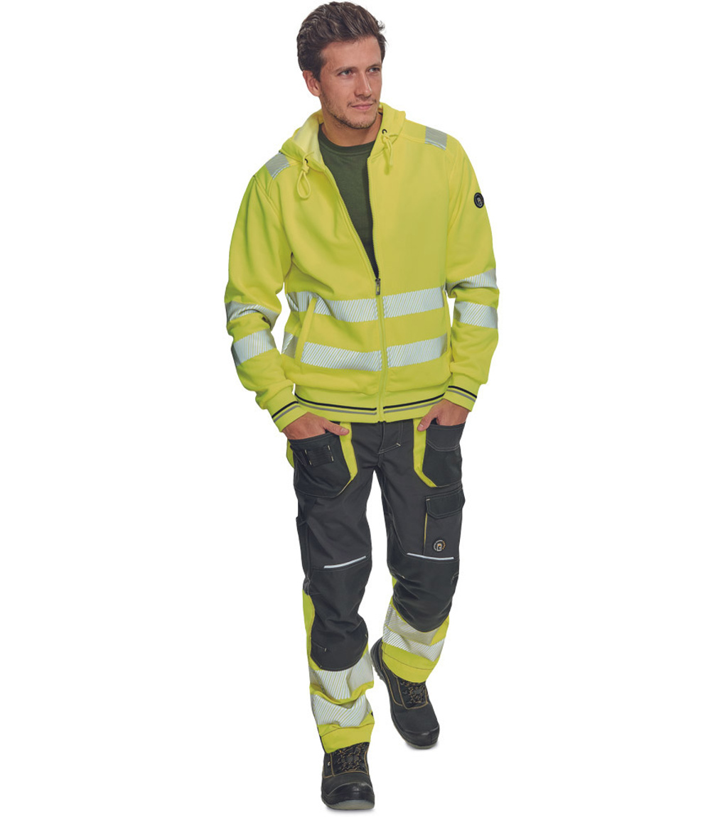 Męska bluza HI-VIS z kapturem wykonana z mieszanki bawełny i poliestru, nieczesana od wewnątrz, podwójny kaptur z kontrastową dzianiną w kolorze zamka i ozdobnymi przeszyciami, elastyczne mankiety i dół