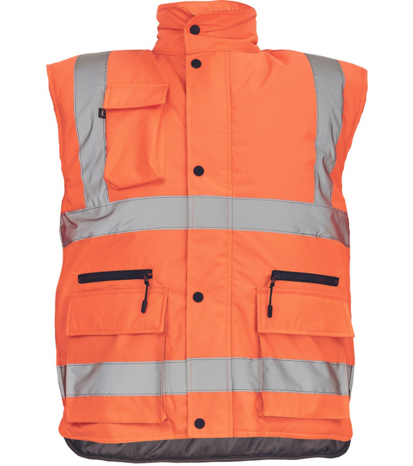 Opis: • ocieplana męska kamizelka ostrzegawcza z kapturem ukrytym w kołnierzu • odblaskowe taśmy o szerokości 5 cm na ramionach i w dolnej części • zamek błyskawiczny przykryty plisą zapinaną na guzik i• 1 kieszeń na piersi na telefon, 2 duże kieszenie przednie z patkami i 2 kieszenie z zamkami błyskawicznymi powyżej