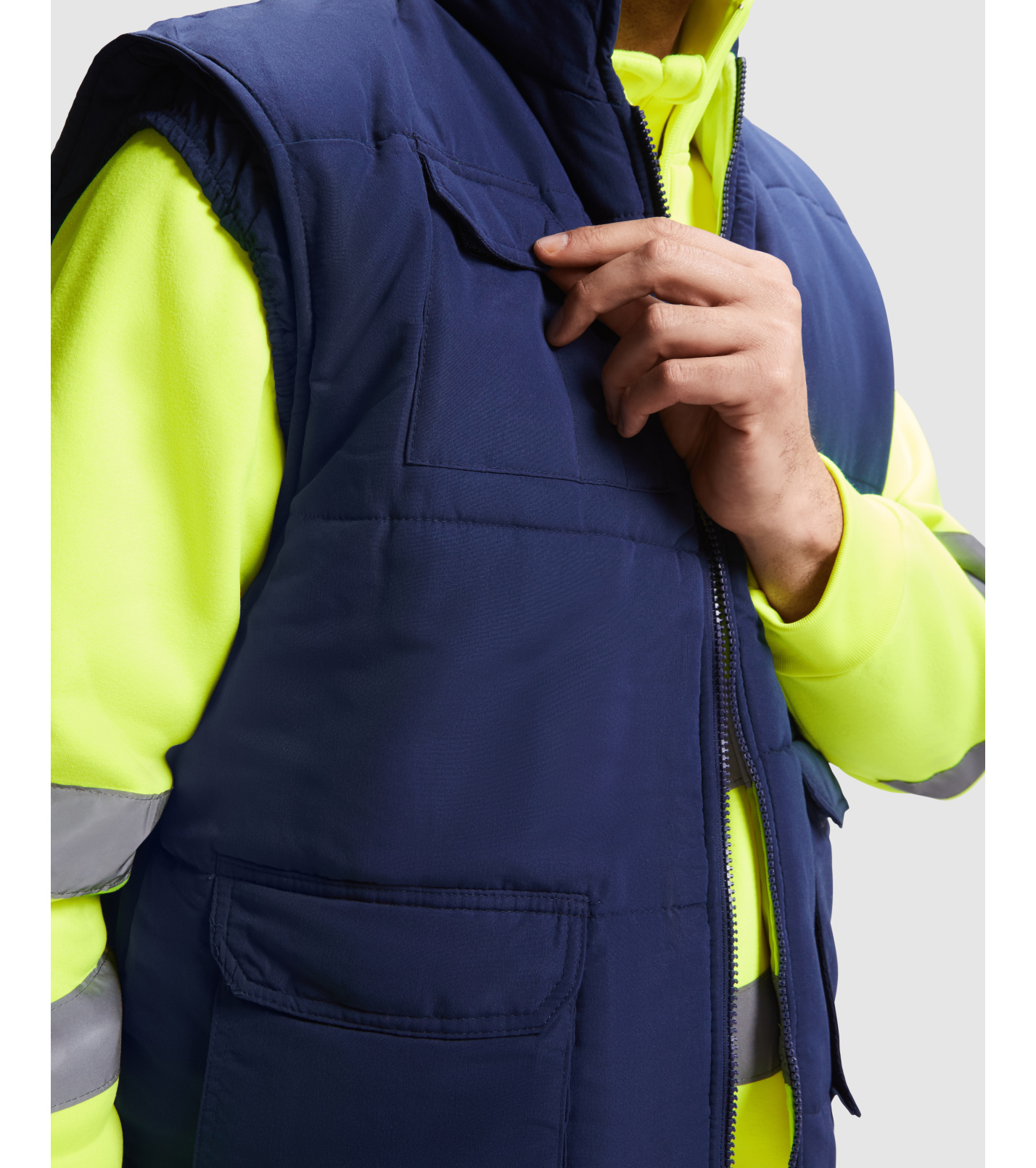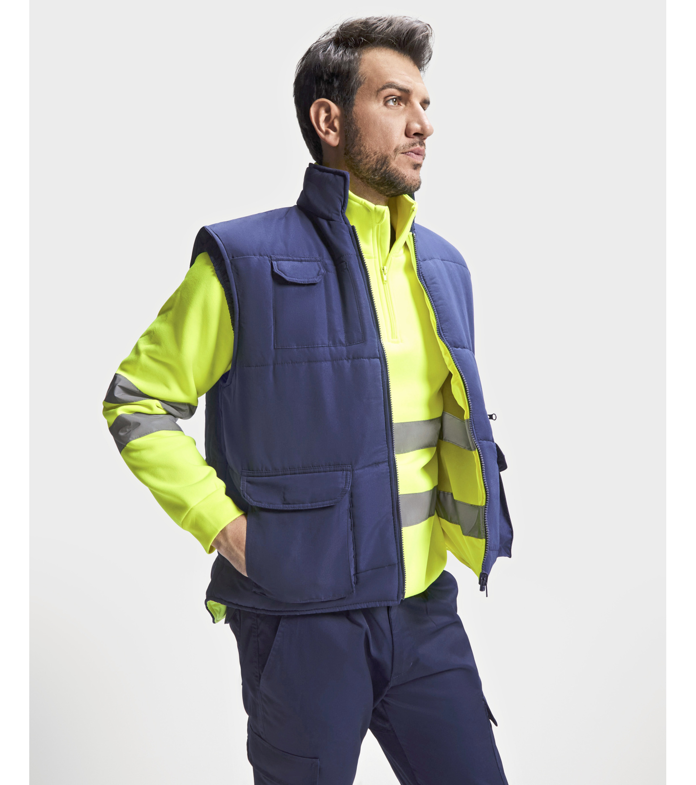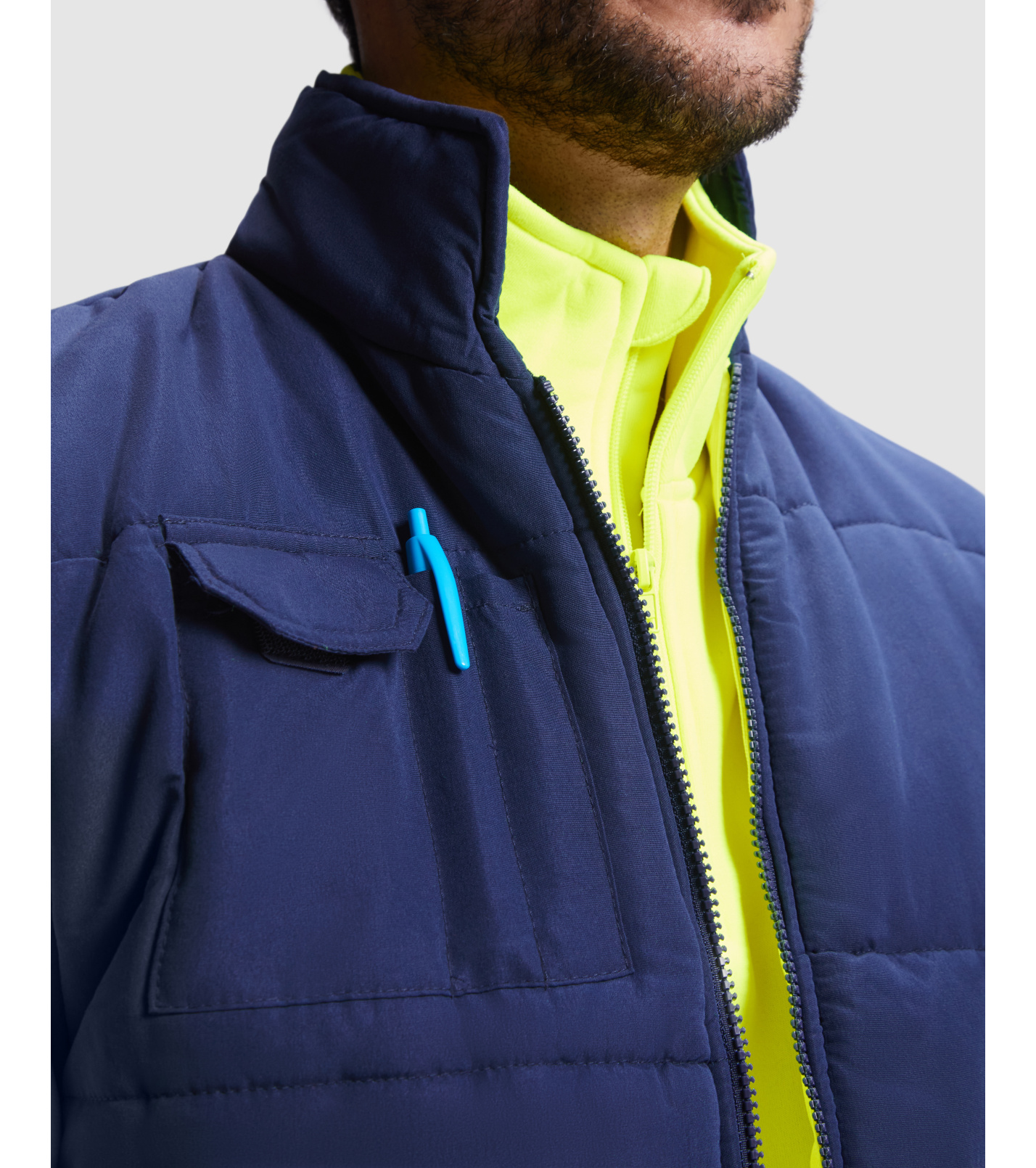 Część zewnętrzna: 100% poliester, tafta; wyściółka: 100% poliester; materiał o wysokiej widoczności: 100% poliester single jersey, 450 g/m?Kurtka o wysokiej widoczności z wieloma kieszeniami i wysokim kołnierzem