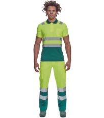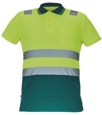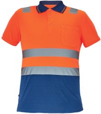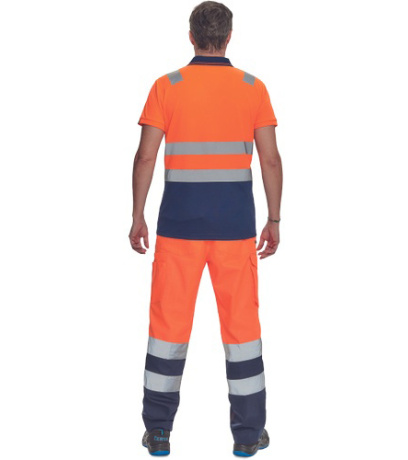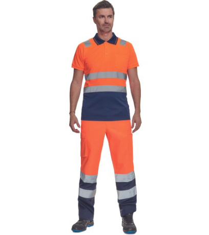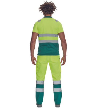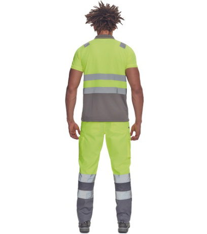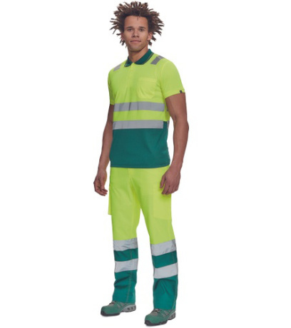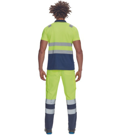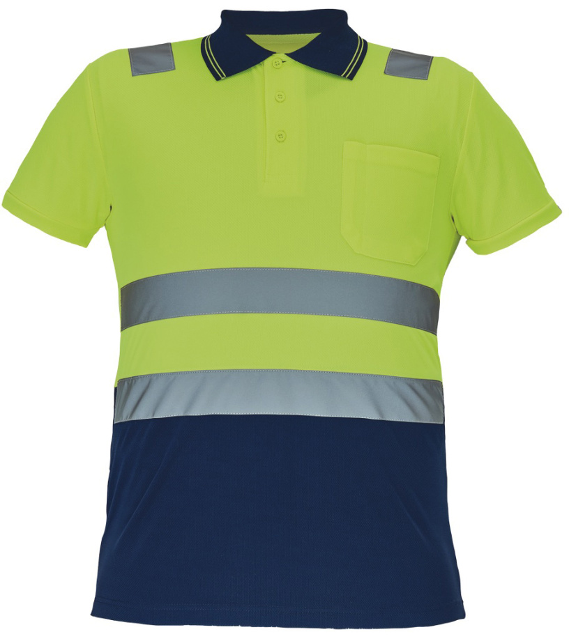 Opis: • ostrzegawcza koszulka polo z odblaskowymi taśmami o szerokości 5 cm na ramionach i na obwodzie, zapięcie na 3 guziki, dziany kołnierzyk i obszycie rękawów