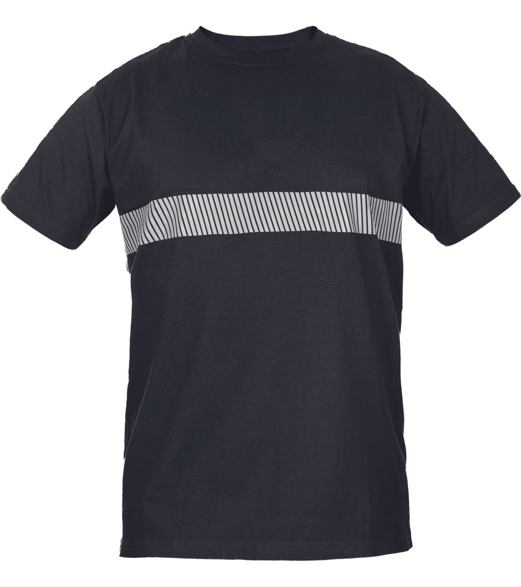 Opis: Bawełniany T-shirt dla kobiet i mężczyzn z nadrukowanymi, segmentowymi taśmami odblaskowymi na piersi.