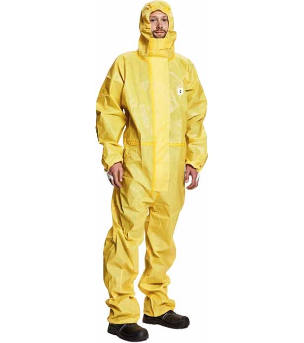 Opis: ochronny kombinezon antystatyczny z kapturem, z nieprzepuszczalną warstwą ochronną