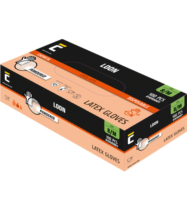 Rękawice jednorazowe lateksowe, pudrowane, nadające się do krótkotrwałego kontaktu z produktami spożywczymi.