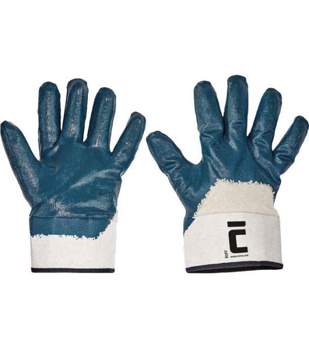Granatowe rękawice szyte z bawełnianej dzianiny, w całości pokryte nitrylem, sztywny mankiet.
