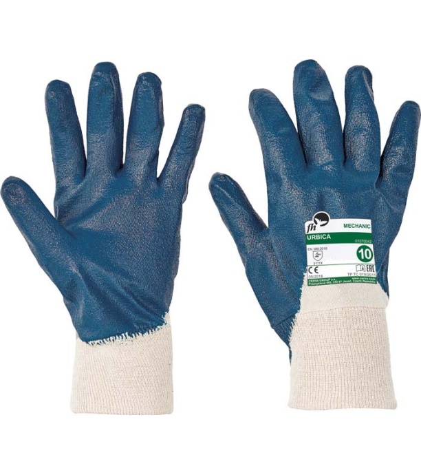 Rękawice szyte z bawełnianej dzianiny, częściowo pokryte nitrylem, z elastycznym ściągaczem.