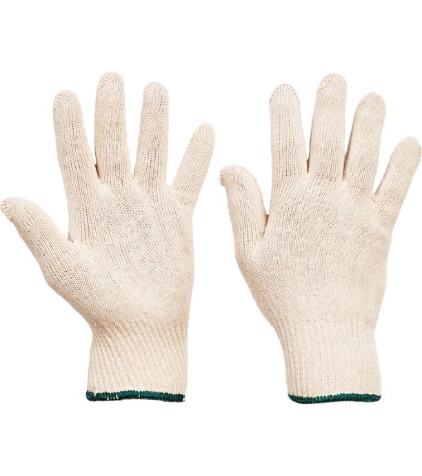 Rękawice bezszwowe, dziane, z bawełny, z elastycznym mankietem.