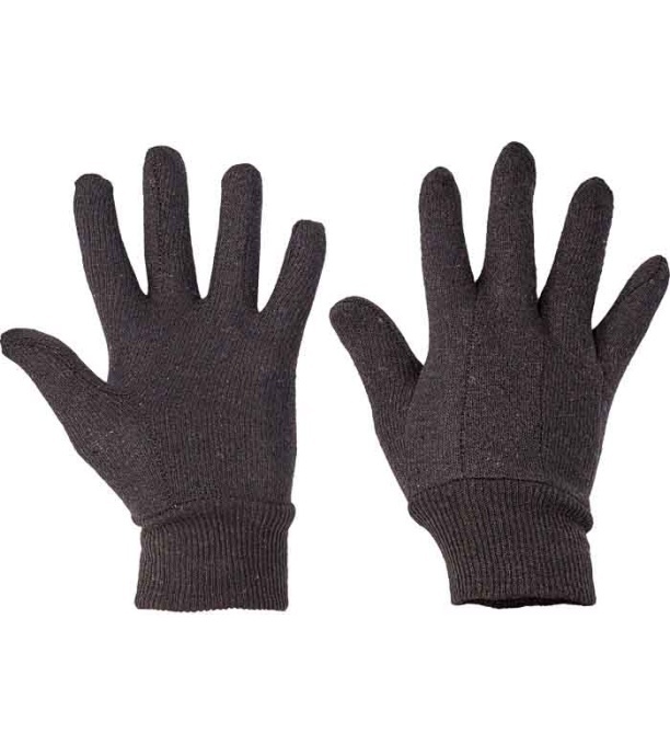 Rękawice szyte z brązowego, bawełnianego dżerseju, elastyczny ściągacz.