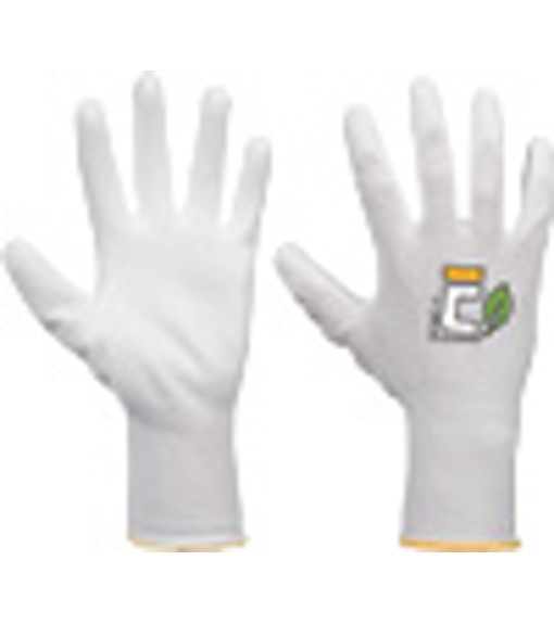 Te wysokiej jakości, pięciopalczaste, bezszwowe rękawice wykonane są z białej przędzy poliestrowej z recyklingu, dzięki czemu są lekkie, oddychające i przyjazne dla środowiska. Powierzchnia dłoni pokryta jest białym poliuretanem na bazie wody (PU), który zapewnia doskonałą przyczepność i wysoką wrażliwość palców podczas pracy. Rękawice idealnie nadają się do precyzyjnych i delikatnych prac, gdzie wymagana jest wysoka wydajność, komfort i odpowiedzialne podejście do środowiska. Nie zawierają DMF (dimetyloformamidu), co czyni je bezpieczniejszymi dla użytkownika i środowiska.