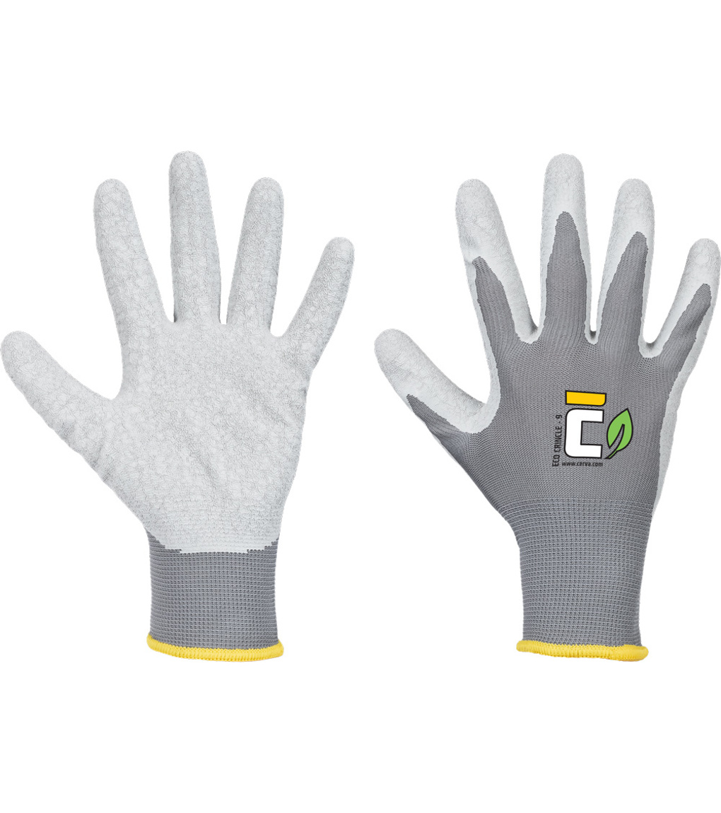 Te wytrzymałe, pięciopalczaste, bezszwowe rękawice robocze wykonane są z szarej przędzy poliestrowej z recyklingu, zapewniając długotrwałą wytrzymałość i komfort przez cały dzień pracy. Wnętrze dłoni pokryte jest szarym, marszczonym lateksem, który zapewnia doskonałą przyczepność i wysoką odporność na ścieranie zarówno w suchym, jak i mokrym środowisku. To idealny wybór do wymagających warunków pracy, gdzie wymagana jest niezawodność, wydajność i przyjazność dla środowiska.