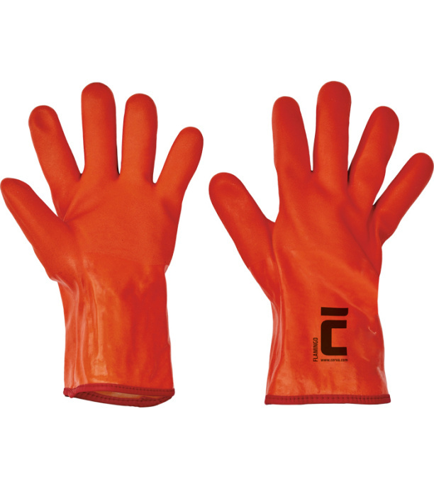 Opis: Rękawice szyte z bawełnianej dzianiny, powlekane PVC, z poliuretanową wkładką i podszewką z dzianiny, całkowita długość 35 cm.