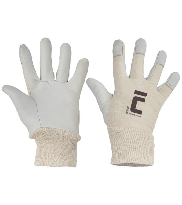 Rękawice wzmacniane skórą owczą licową, bawełniana tkanina na grzbiecie dłoni, z przekrytymi skórą końcówkami palców oraz elastycznym ściągaczem.