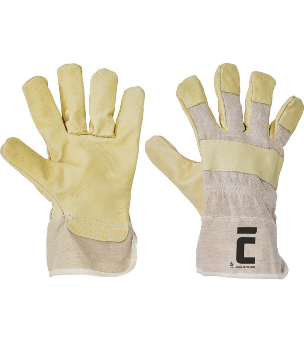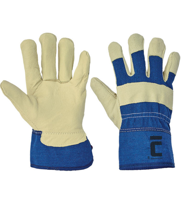 Rękawice robocze w częsci dłonicowej wykonane ze świńskiej skóry , materiał na grzbietach i mankietach.