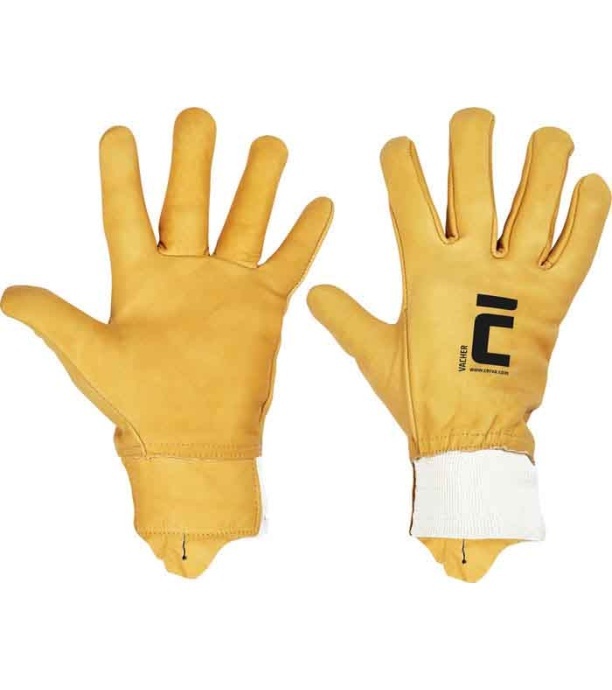 Szyte, wodoodporne rękawice wykonane ze skóry bydlęcej. Mankiet wzmacniany skórą, w górnej części elastyczny ściągacz.