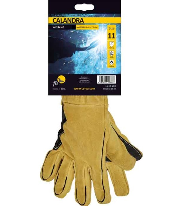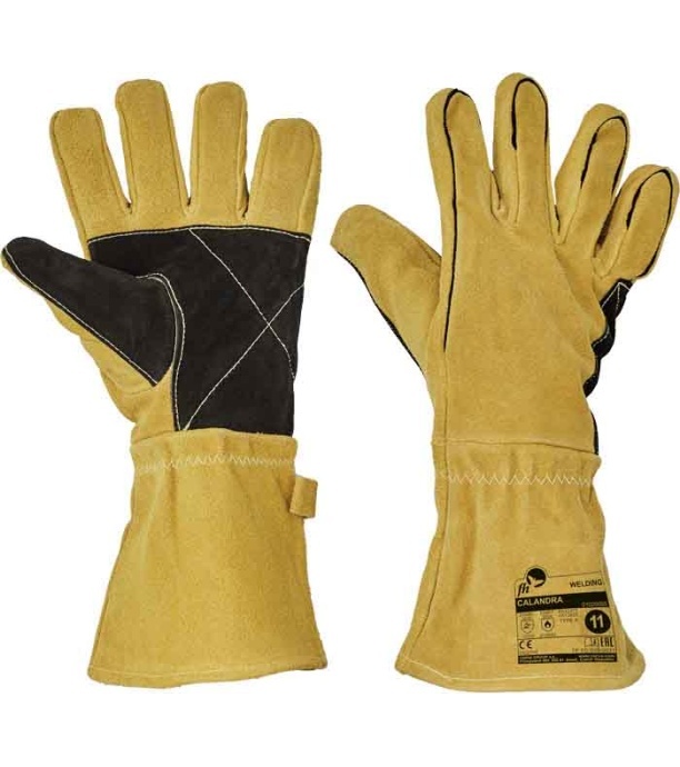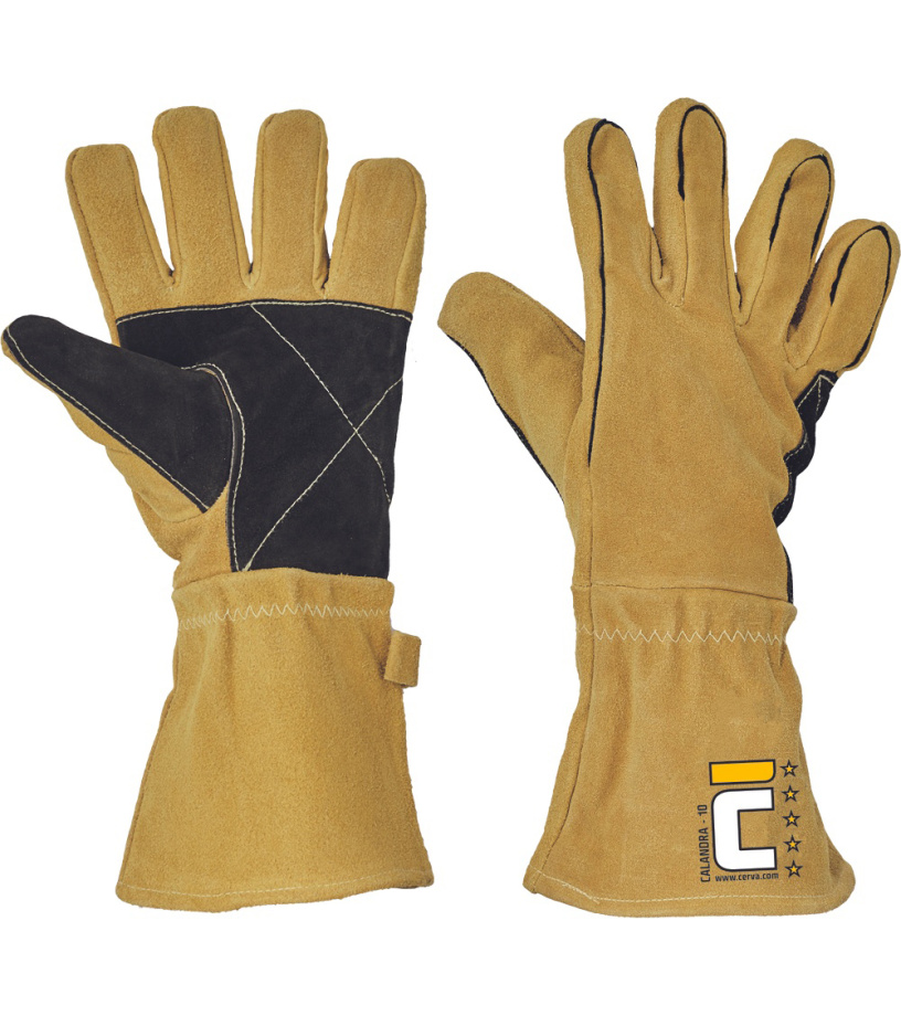 Rękawice skórzane dla spawaczy, wykonane z dwoiny bydlęcej, z podszewką bawełnianą, wzmacniane w części chwytnej i okolicach kciuka, szyte nićmi kewlarowymi.
