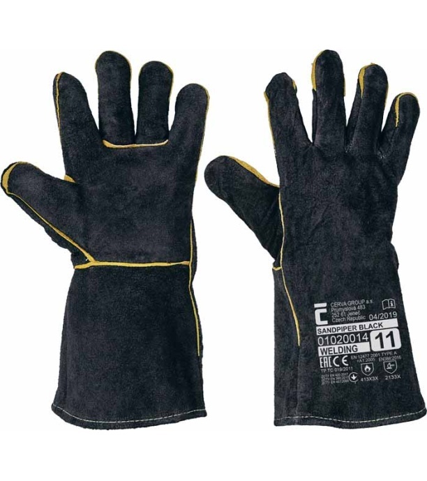 Materiał: Podszewka rękawic: bawełna Materiał rękawic: dwoina bydlęca Materiał mankietu: dwoina bydlęca Opis: Rękawice skórzane z dwoiny wołowej o długości 35 cm, z bawełnianą podszewką i krytymi szwami. Certyfikat: prace spawalnicze - typ A