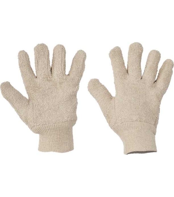 Rękawice szyte z grubej bawełny frotte, elastyczny ściągacz.