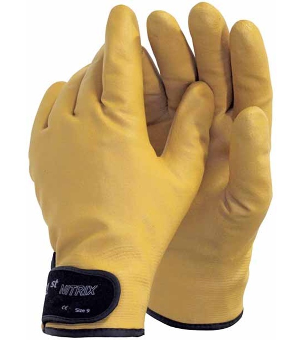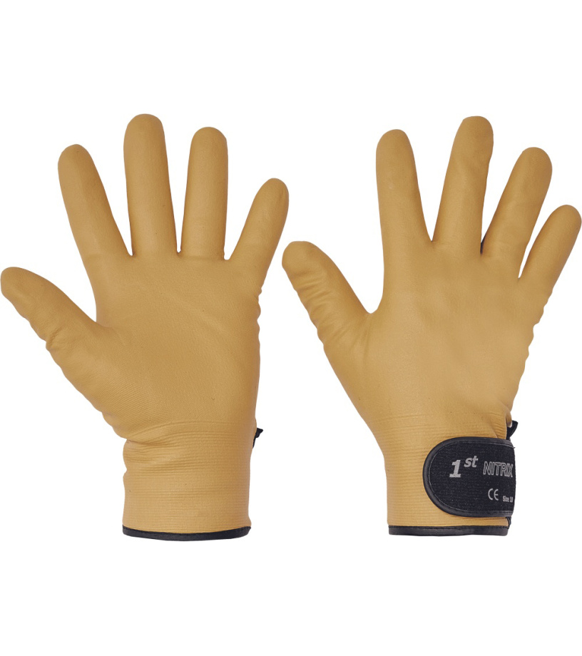 Materiał: Materiał powleczenia: nitryl Podszewka rękawic: bawełna, Dzianinowy Materiał rękawic: poliamid (nylon), Dzianinowy Materiał mankietu: guma, velcro