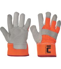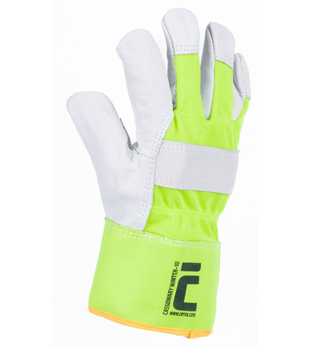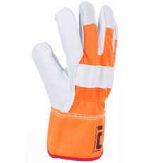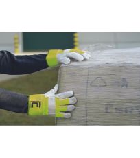 Ocieplane rękawice wzmacniane delikatną, jednokolorową licową skórą wołową w części chwytnej dłoni, grzbiet dłoni oraz mankiet wykonane z dzianiny poliestrowej w kolorze odblaskowym.