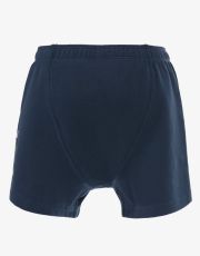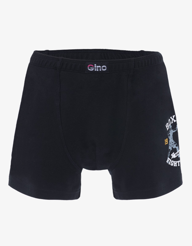 Bokserki z dłuższymi nogawkami, chłopięca bielizna szyta. W pasie wszyta szersza gumka. Tył podzielony klinem z dwoma szwami. Bokserki ozdobione są większym nadrukiem z motywem bokserskim z boku.
