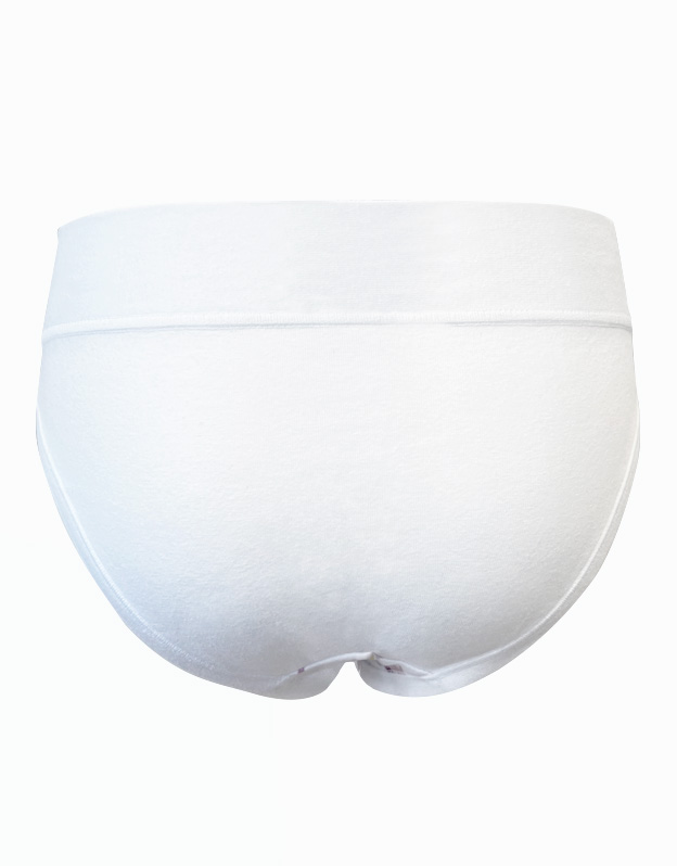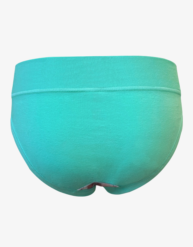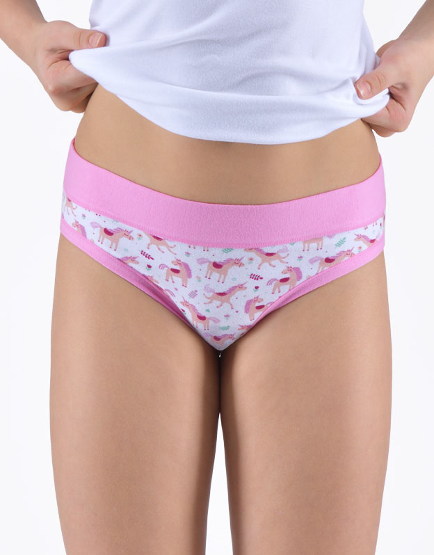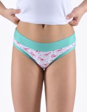 Figi o klasycznym kroju z szerszym pasem, szyte. Pas wykończony jest szerszym paskiem z tego samego materiału. Nogawki wykończone są wąskim pasem z tego samego materiału. Przód z nadrukiem. Tył i pas w jednolitym kolorze.