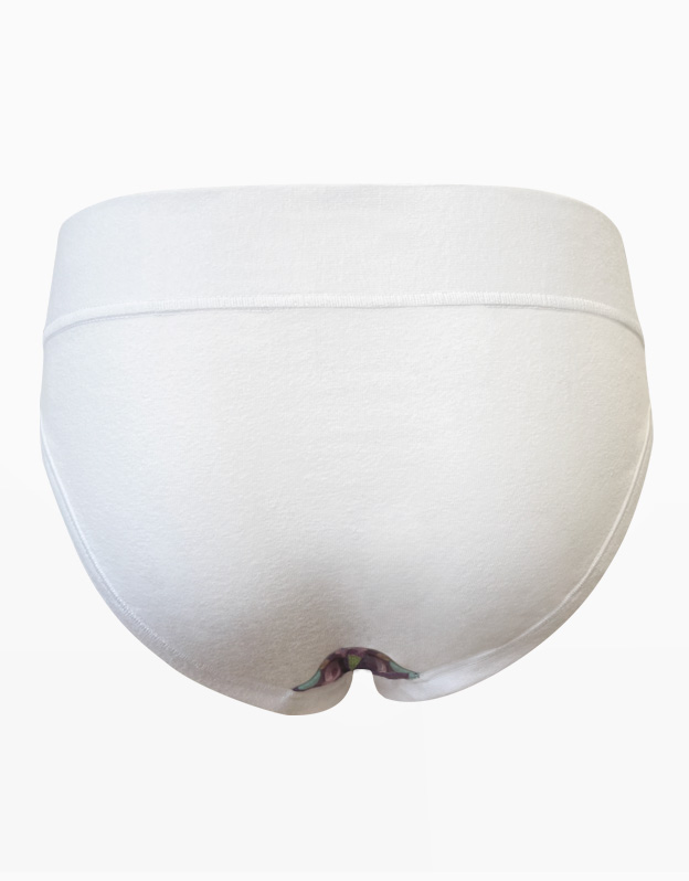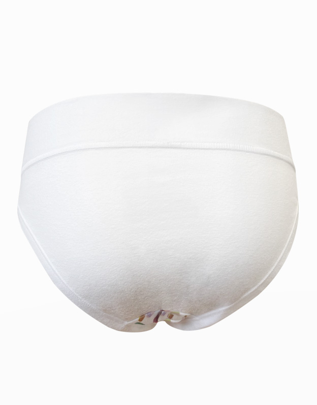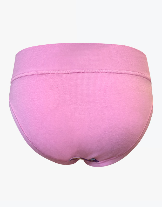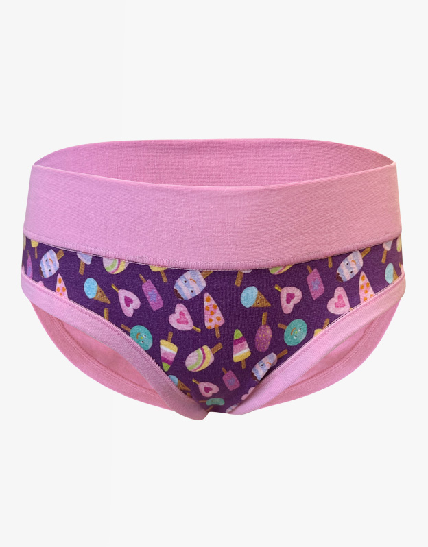 Majtki dziewczęce o klasycznym kroju mają szerszy pas. Majtki wykończone są wąskią lamówką wykonaną z tego samego materiału. Przód zdobi nadruk z motywem lodów na patyku. Tył i obszycie są w jednolitym kolorze.