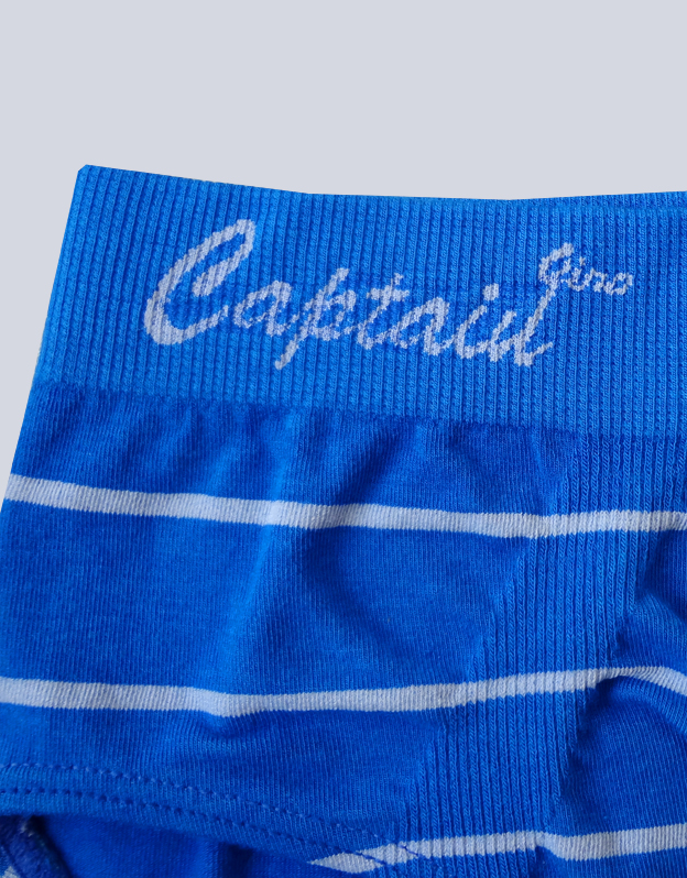 Slipki z szerszym bokiem, bezszwowa bielizna chłopięca. Pas jest wzmocniony i wykonany w technologii bezszwowej. W nogawkach wszyta jest wąska gumka. Z przodu slipki są wyprofilowane. Slipki mają wąskie kontrastowe paski. W zakładkę wplecione jest kolorowe logo.