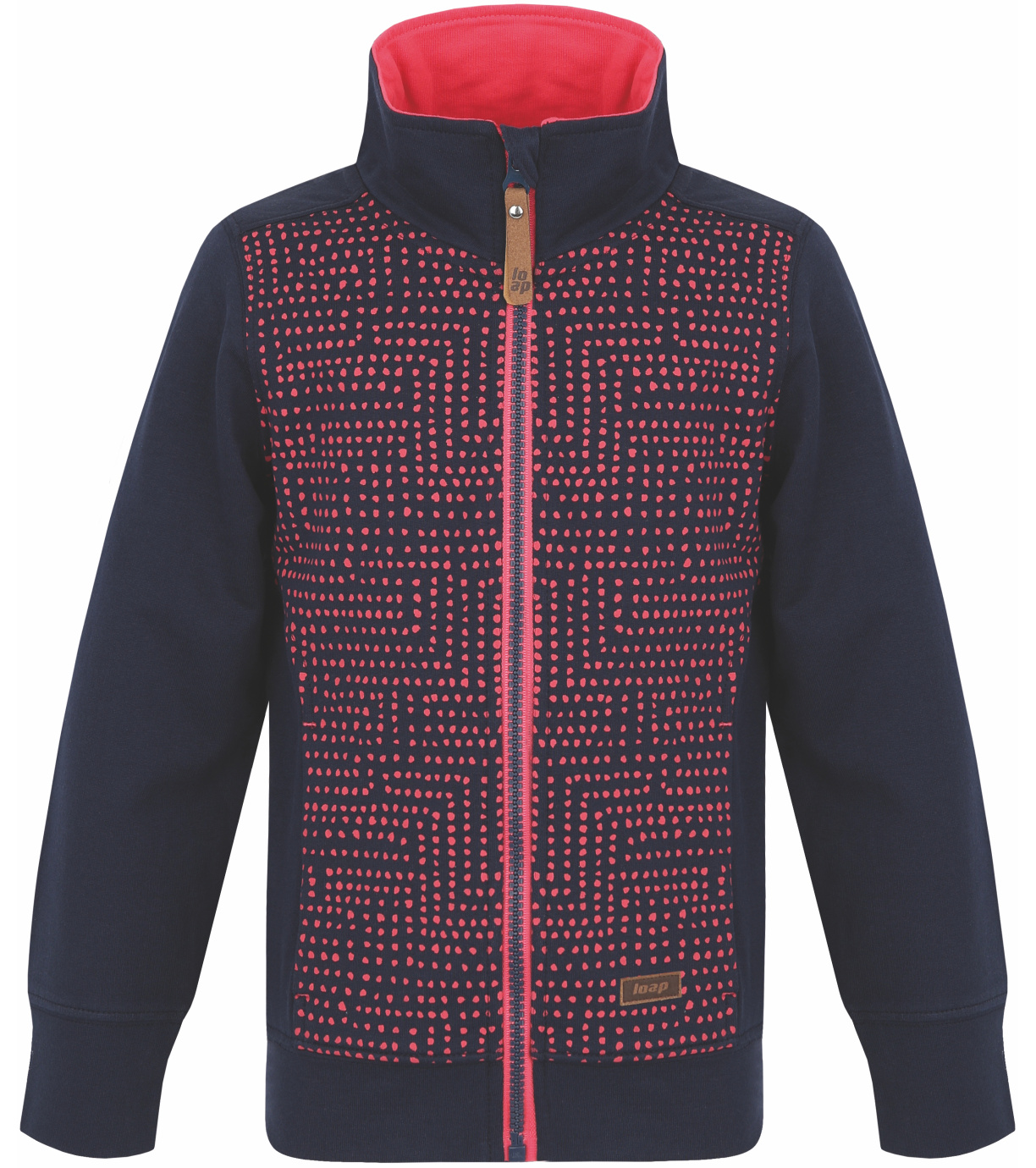 Bawełniana dziewczęca bluza zapinana na zamek Loap DIFENA ma klasyczny krój ze stójką i dwiema bocznymi kieszeniami. Kostkowy zamek błyskawiczny ma praktyczną osłonę na górnym końcu, która chroni podbródek przed zimnem i ewentualnym zranieniem. Przód dziewczęcej bluzy zdobi wysokiej jakości matowy nadruk, który jest przyjemny w dotyku. Twoja mała dziewczynka będzie dobrze wyglądać w szkole, w domu i w czasie wolnym przez cały rok. Dobrze komponuje się z jeansami, legginsami i spodniami dresowymi. Stójka, zamek błyskawiczny z osłoną podbródka. Dwie boczne kieszenie. Nadruk jest przyjemny w dotyku.