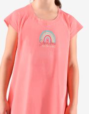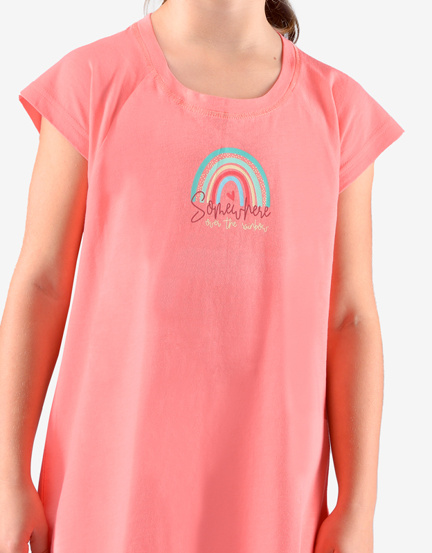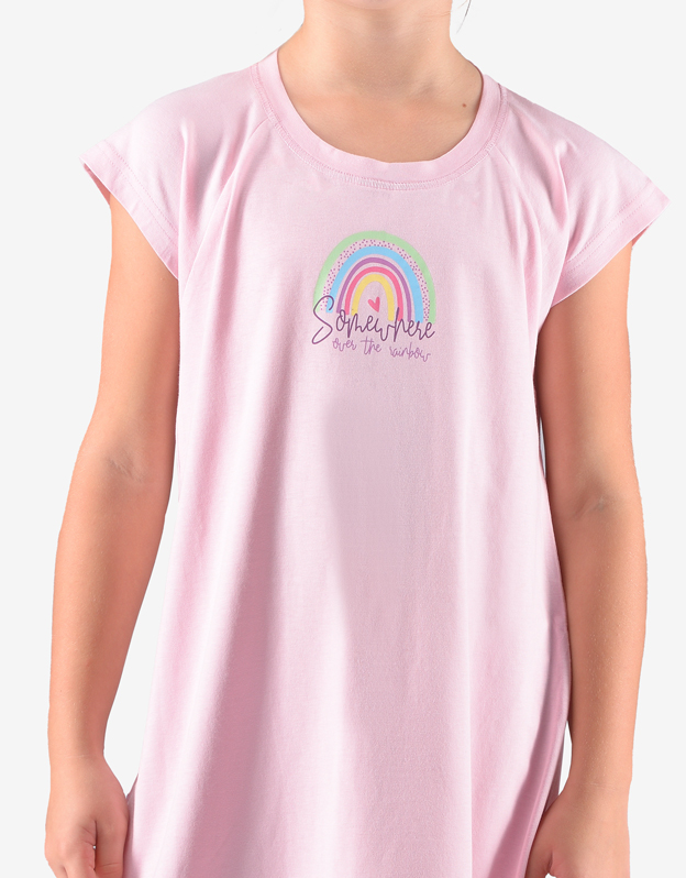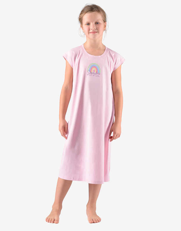 Podstawą dobrej jakości snu jest Twój komfort, w czym pomaga również wygodna bielizna nocna. Dziewczęca koszula nocna z krótkim rękawkiem to idealny wybór dla każdej małej dziewczynki. Koszula nocna ma długość za kolana, śliczny nadruk na piersi, okrągły dekolt, który nie uwiera, a materiał to 100% bawełna - zapewni komfort przez całą noc.