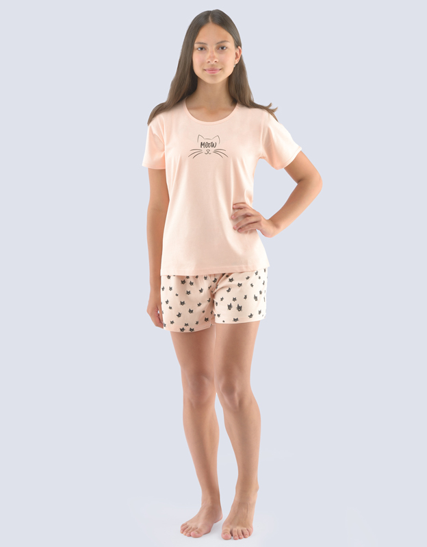 Koszulka z krótkim rękawem i spodenkami, szyta piżama dziewczęca. Spodenki są zadrukowane. Koszula jest jednokolorowa.