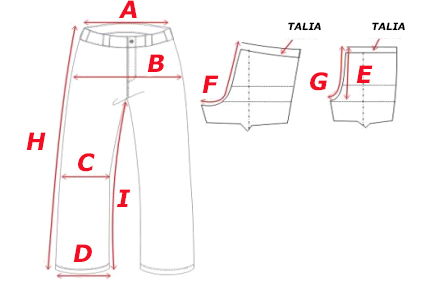 | H  | długość spodni  | 52  | 60  | 68  | 76  |