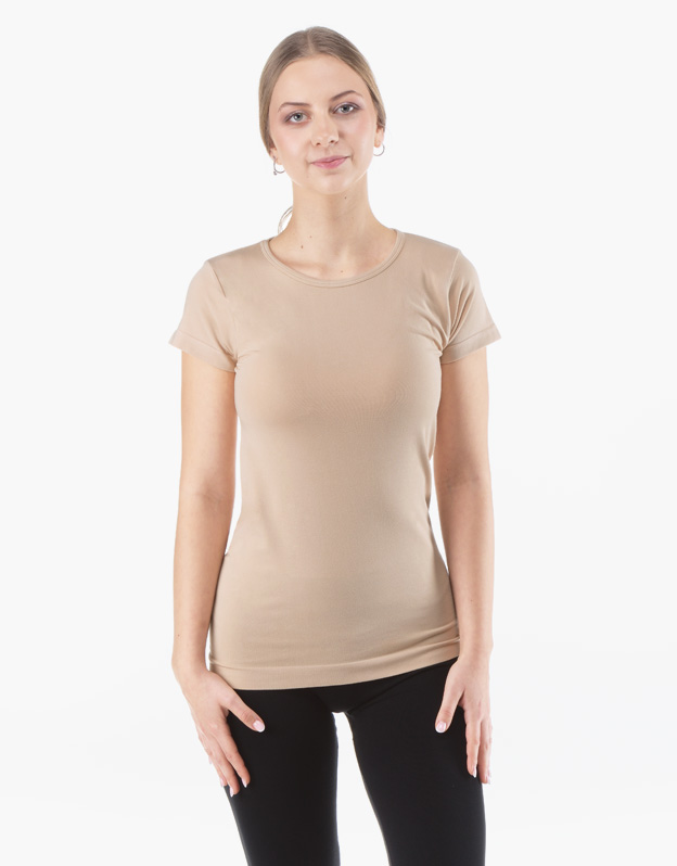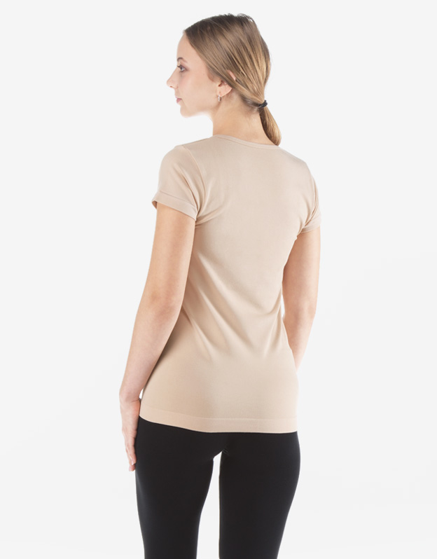 Koszulka z krótkim rękawem, bezszwowa bielizna damska. Dolna krawędź jest wykończona bezszwowo. Dekolt wykończony lamówką. T-shirt nadaje się do noszenia na co dzień i do uprawiania sportu dzięki klasycznie skrojonemu okrągłemu dekoltowi. Koszulka jest jednokolorowa. Nie ma logo.