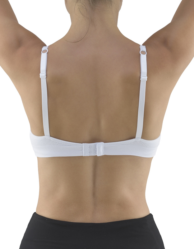 Biustonosz z fiszbinami i prasowanymi miseczkami, bezszwowa bielizna damska. Zewnętrzna część biustonosza wykonana jest z materiału poliamidowego, miseczki z pianki poliuretanowej, która od wewnątrz pokryta jest bawełnianym materiałem. Ramiączka są regulowane. Biustonosz jest gładki. Zapięcie jest trzyrzędowe z 2 haftkami. Z przodu znajduje się kokardka. Biustonosz nadaje się do codziennego noszenia.