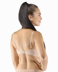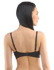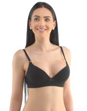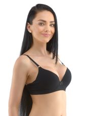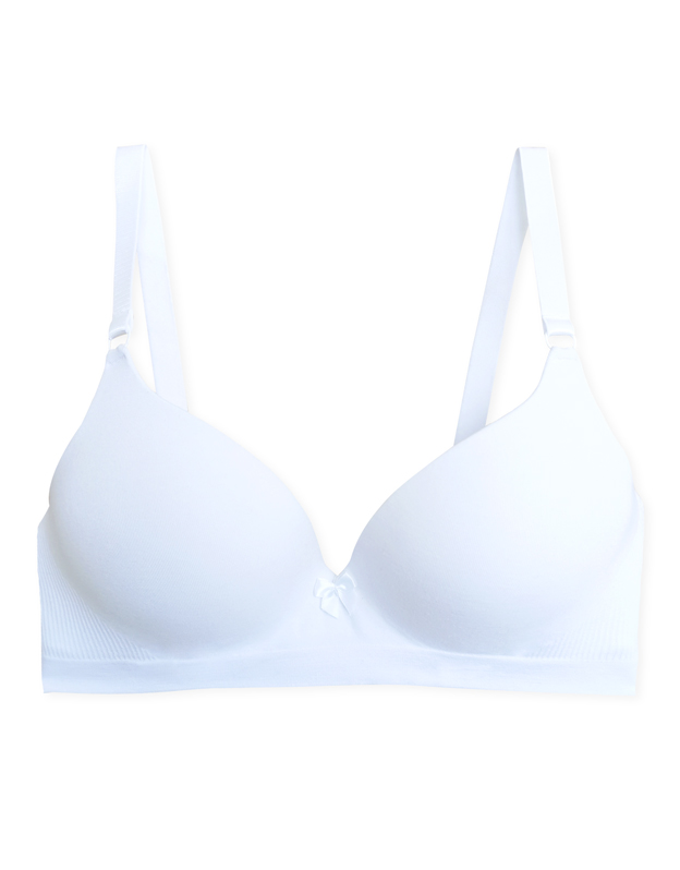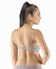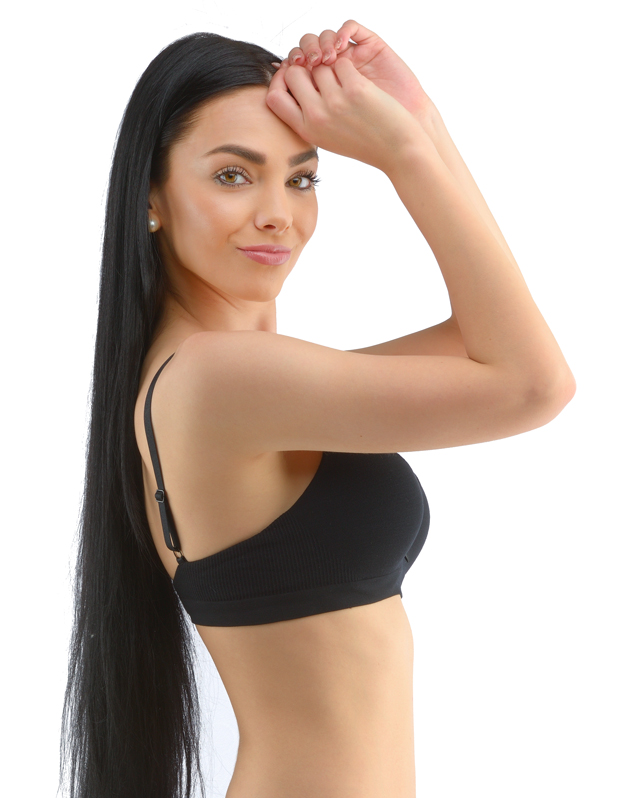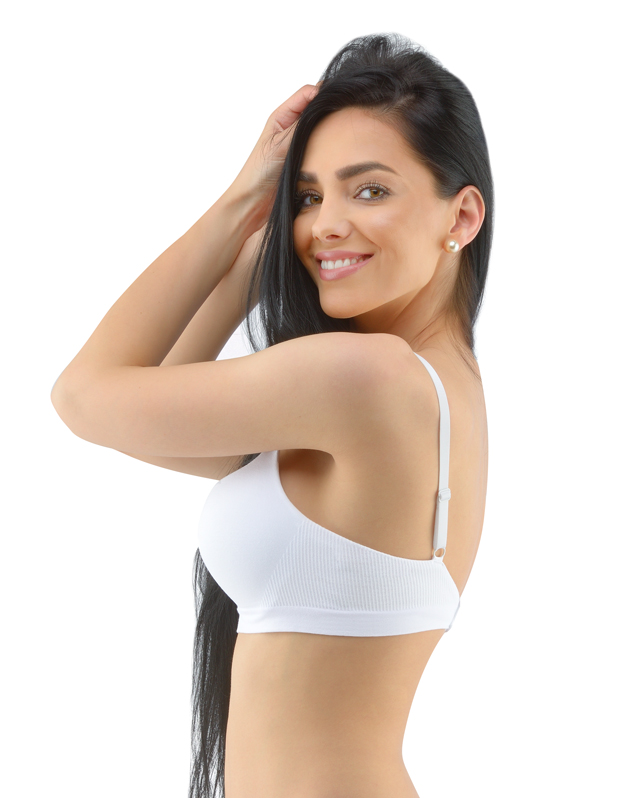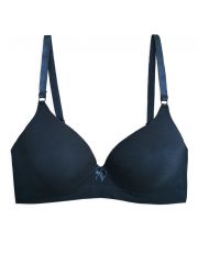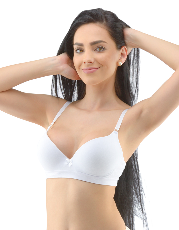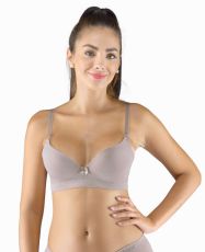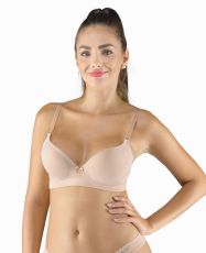 Biustonosz z fiszbinami i prasowanymi miseczkami, bezszwowa bielizna damska. Zewnętrzna część biustonosza wykonana jest z materiału bambusowego, miseczki z pianki poliuretanowej, która od wewnątrz pokryta jest bawełnianym materiałem. Krawędzie miseczek są gładkie bez obramowania. Ramiączka są regulowane. Biustonosz jest w jednym kolorze. Zapięcie jest trzyrzędowe na 2 haftki. Z przodu znajduje się kokardka. Biustonosz nadaje się do noszenia na co dzień.