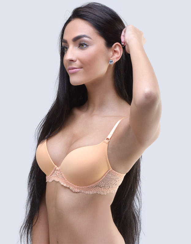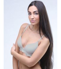 Biustonosz z fiszbinami i prasowanymi miseczkami, szyta bielizna damska. Miseczki są gładkie. Tylna część wykonana z koronki. Ramiączka są regulowane. Biustonosz jest jednokolorowy. Zapięcie jest trzyrzędowe z 2 haftkami.