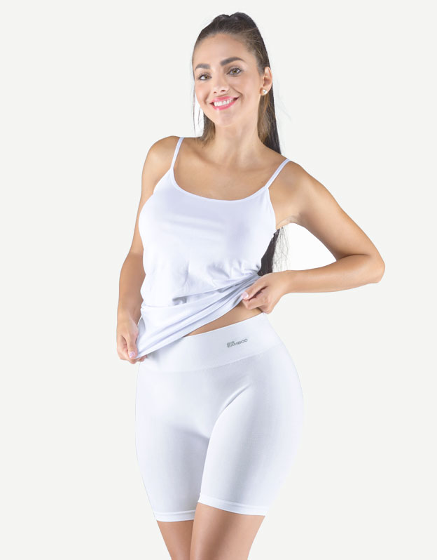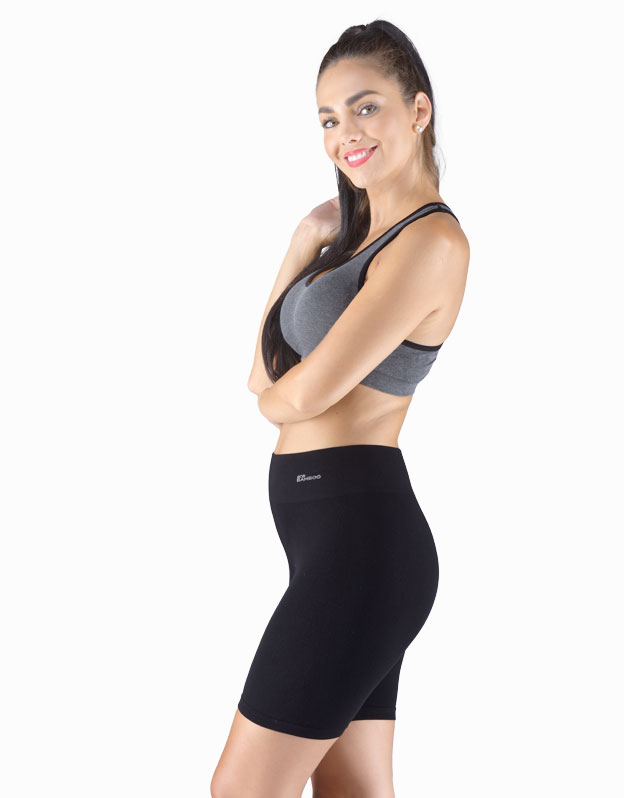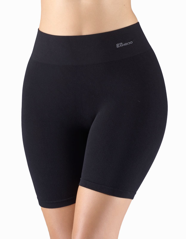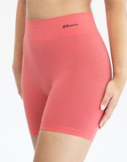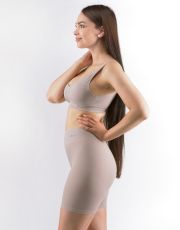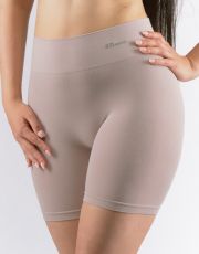 Majtki z dłuższymi nogawkami i szerokim pasem, bokserki, bielizna damska bezszwowa. Pas jest wzmocniony i wykończony bezszwowo. Nogawki są wykończone bezszwowo. W kroku wszyty jest klin. Bokserki są jednokolorowe. W zakładce tkane logo.
