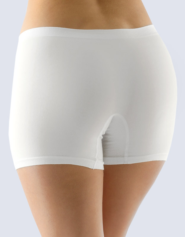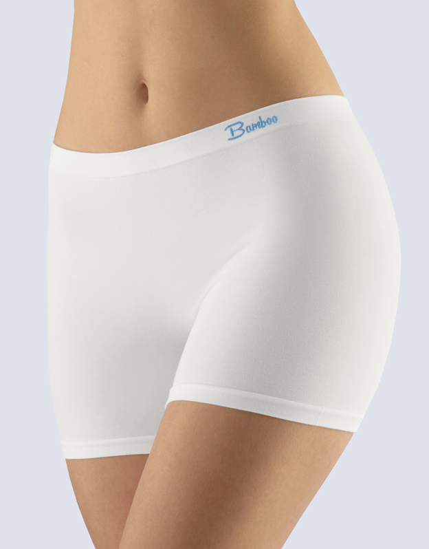 Majtki z dłuższymi nogawkami, bokserki, bielizna bezszwowa damska. Pas jest wzmocniony i wykonany w technoogii bezszwowej tak samo jak nogawki. W kroku wszyty jest klin. Majtki są gładkie. W zakładkę wplecione jest kolorowe logo.