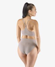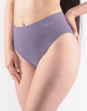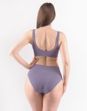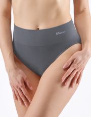 Figi o klasycznym kroju z szerokimi bokami i szeroką zakładką w talii, bezszwowa bielizna damska. Pas jest wzmocniony i wykonany w technologii bezszwowej. W nogawkach wszyta jest wąska gumka. Majtki są jendokolorowe. W zakładce dzianinowe logo w kolorze szarym.