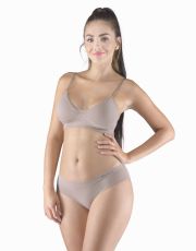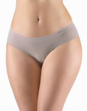 Figi biodrówki o kroju francuskim z szerokimi bokami, bezszwowa bielizna damska. Pas jest wzmocniony i wykonany w technologii bezszwowej. Majtki są gładkie. W zakładce dzianinowe logo w kolorze szarym.