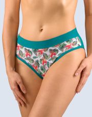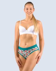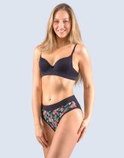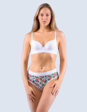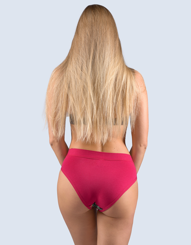 Majtki o klasycznym kroju z szerszą talią, szyta bielizna damska. Pasek obszyty jest szerszą lamówką z tego samego materiału. Nogawki wykończone są wąską lamówką z tego samego materiału. Nadruk z przodu. Tył i lamówki są jednokolorowe.