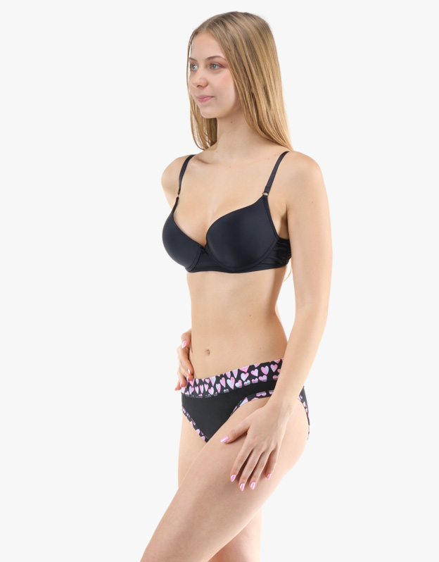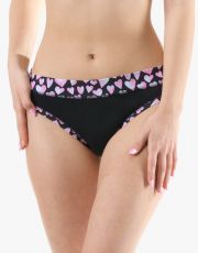 Majtki o klasycznym kroju z wąskim bokiem i szerszym pasem, damska bielizna szyta. Pas wykończony jest szerszym dołem z tego samego materiału. Nogawki zakończone są wąskim dołem z tego samego materiału. Przód w jednolitym kolorze, ściągacze w pasie i na nogawkach są zadrukowane.