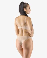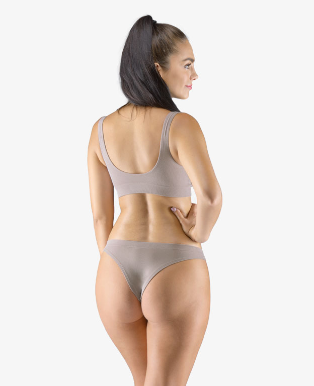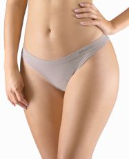 Figi biodrówki z węższym bokiem, brazylijska bielizna bezszwowa dla kobiet. Obszar talii jest wzmocniony i szytybezszwowo. Majtki są jednokolorowe. Logo dzianinowe w kolorze szarym.
