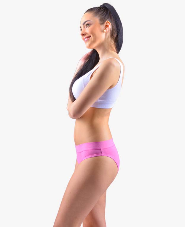 Majtki biodrówki z szerszym bokiem oraz z szerszą lamówką w pasie, szyta bielizna damska. Nogawki wykończone są wąską lamówką z tego samego materiału. Majtki są jednokolorowe.