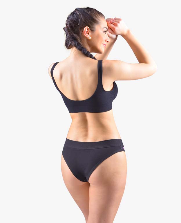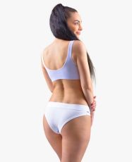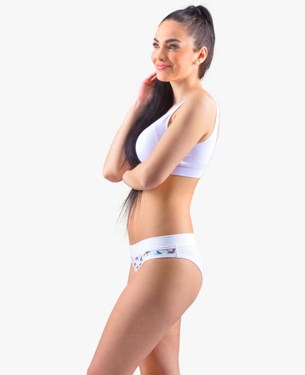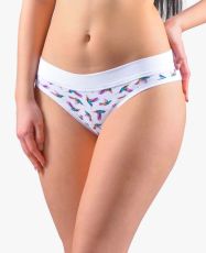 Majtki brazyliany, z wąskim bokiem i szeroką lamówka w pasie, damska bielizna szyta. Talia wykończona jest szerszym obszyciem z tego samego materiału. Majtki zakończone są wąską lamówką z tego samego materiału. Przednia część ma nadruk. Tył i lamówki nogawek są jednokolorowe.