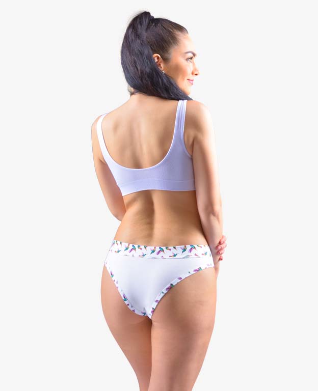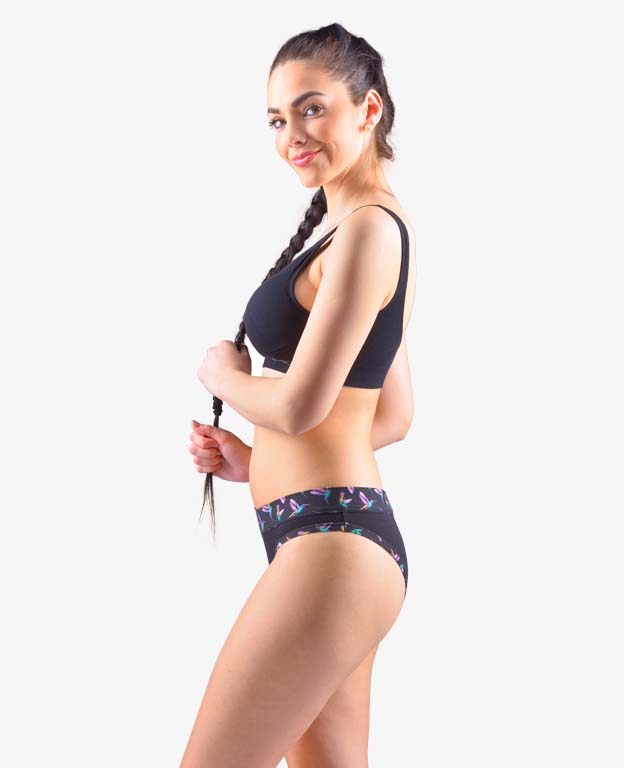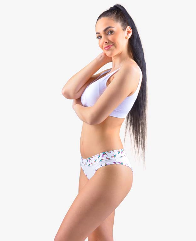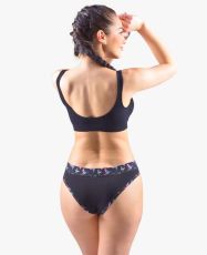 Majtki brazyliany z wąskim bokiem i szeroką lamówką w pasie, damska bielizna szyta. Talia wykończona jest szerszym obszyciem z tego samego materiału. Majtki zakończone są wąską lamówką z tego samego materiału. Pas i lamowki nogawek mają nadruk. Przód i tył są jednokolorowe.